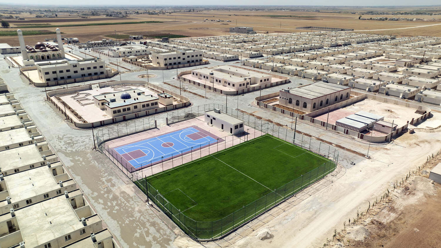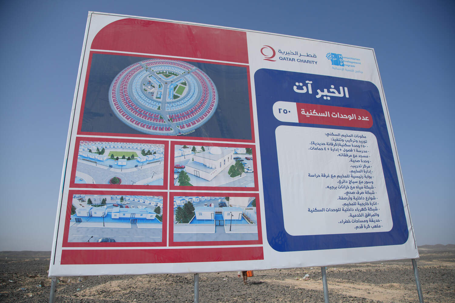 - المرافق المتكاملة: مدرسة، ومسجد، ووحدة صحية، ومركز تدريب مهني، وملعب رياضي، وشبكات مياه وصرف صحي، ومنظومة طاقة شمسية.